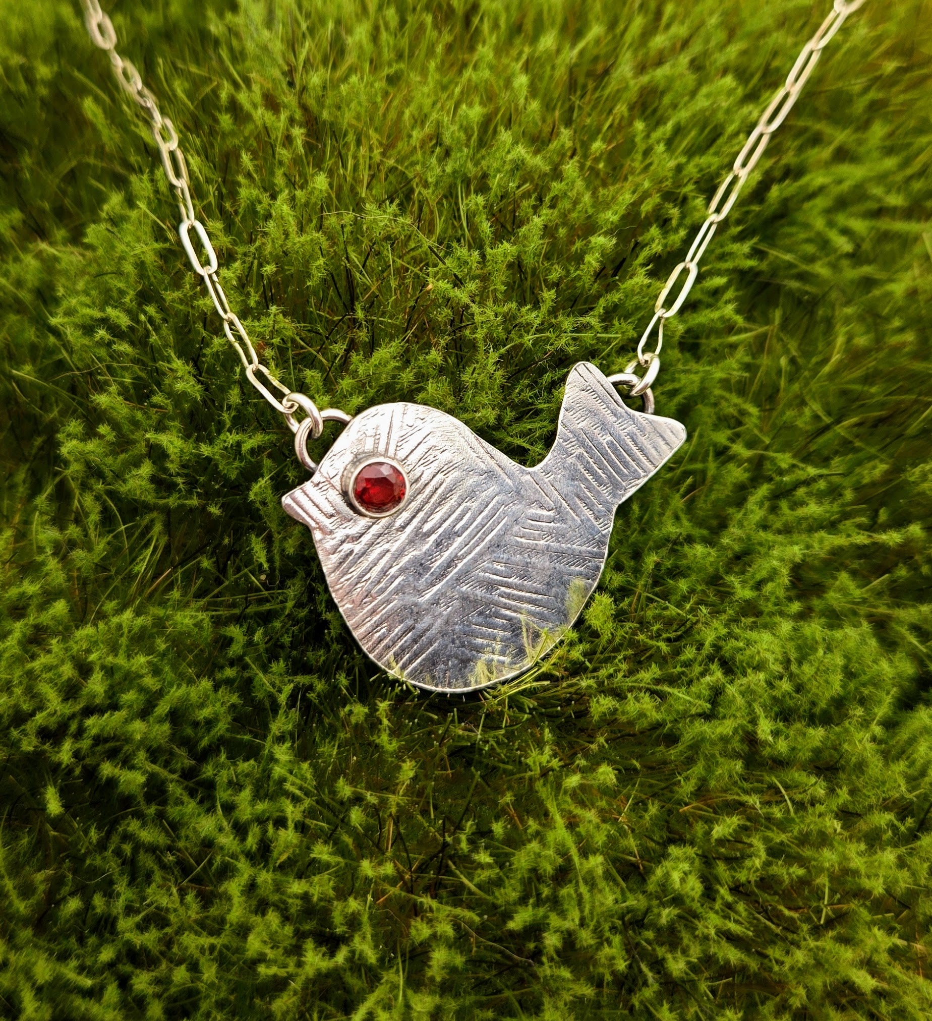 Elevate your style with our Embossed Sterling Bird Necklace. Crafted from high-quality sterling silver, this bird features a delicate embossed design, accented by a vibrant garnet eye. Complete with a 16 inch chain, it's perfect for adding an elegant touch to any outfit.