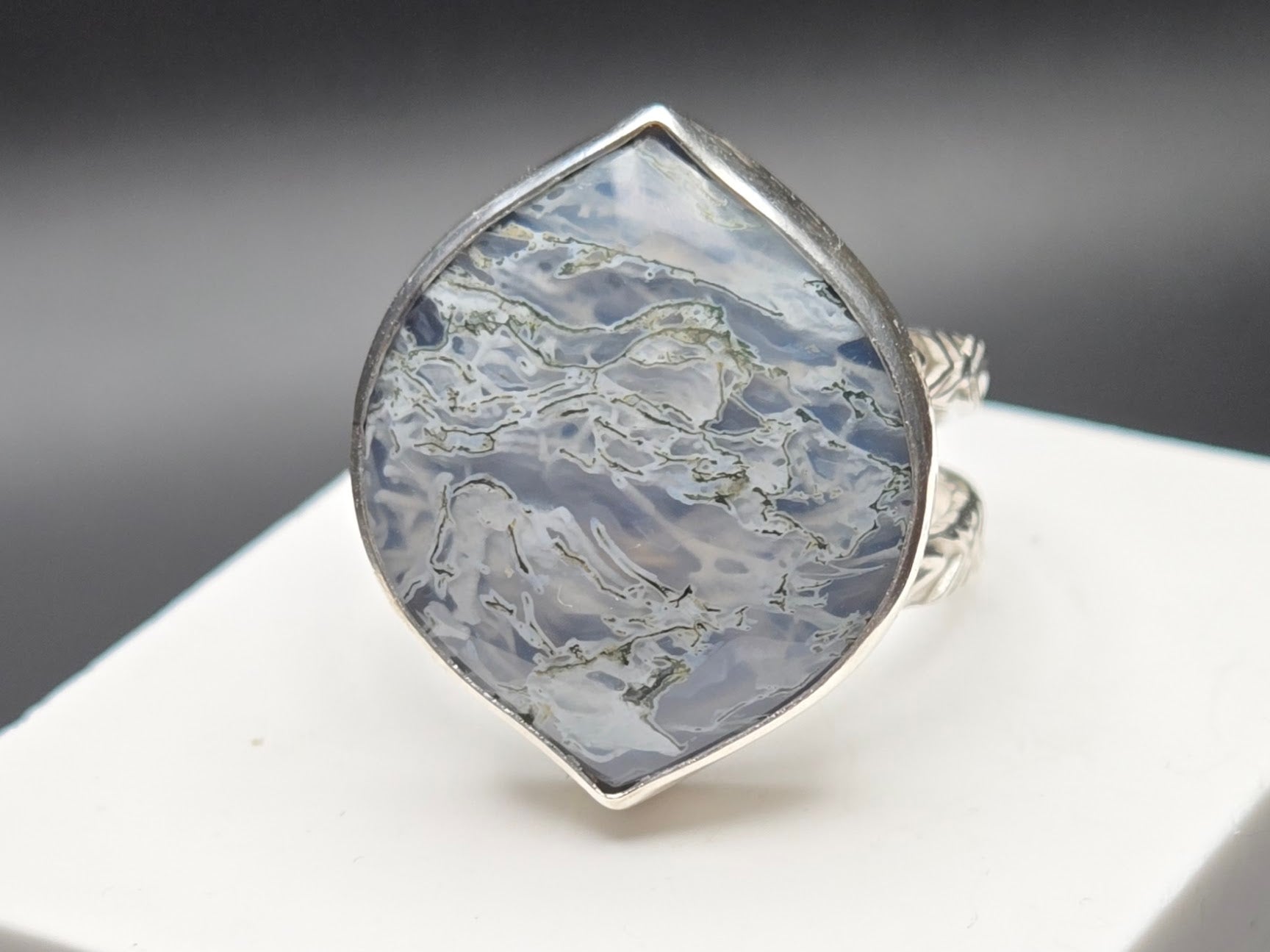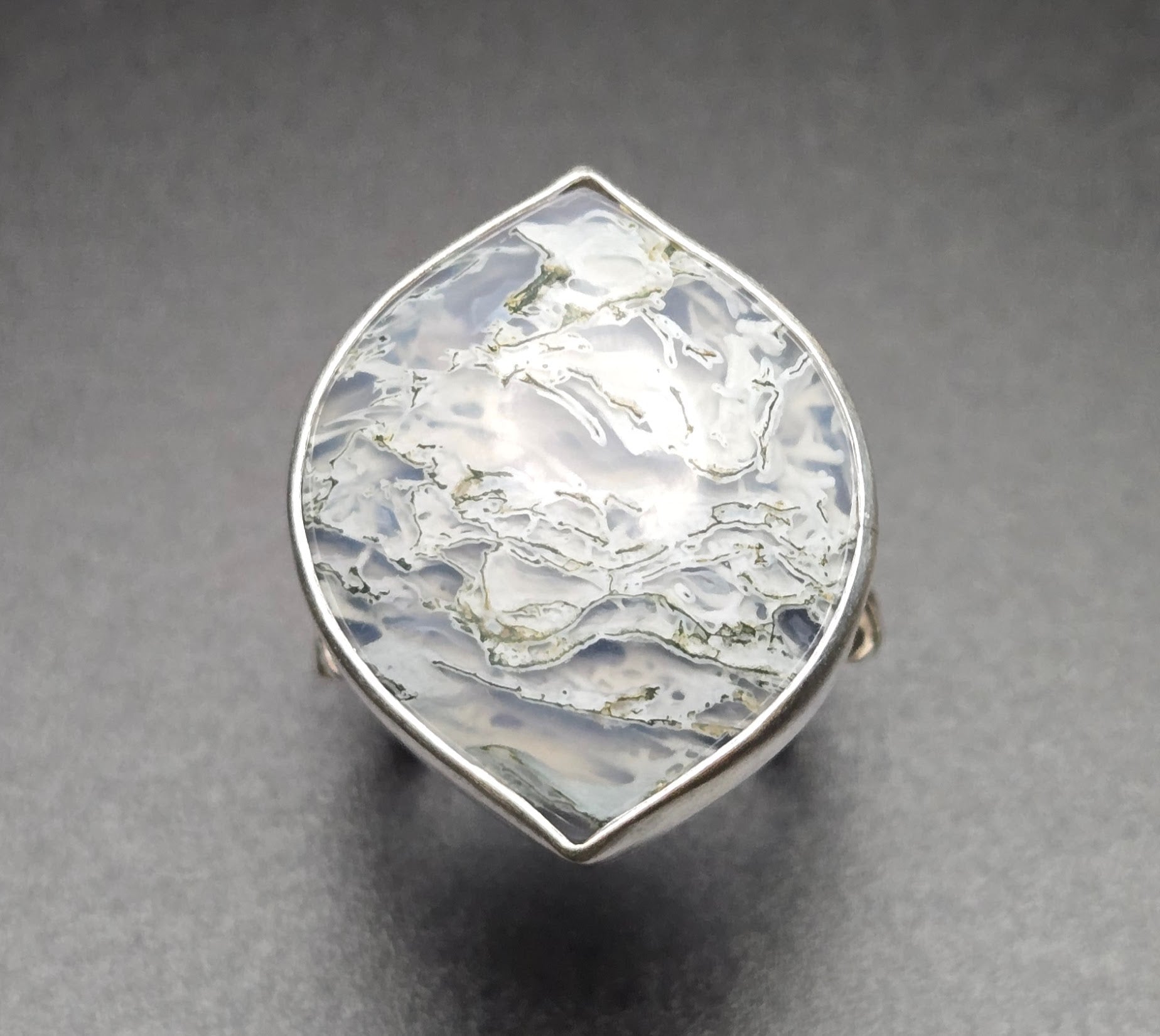This striking ring features a marquis-cut moss agate stone showcasing delicate pale green and white swirls reminiscent of natural landscapes. Set in fine sterling silver with a substantial double band design, the stone sits securely in a refined setting that emphasizes its organic beauty. The pale green hues and wispy patterns of the moss agate create a sophisticated, earthy aesthetic perfect for those who appreciate gemstones with character and depth. Sized at 7.5, this piece combines elegant craftsmanship with the timeless appeal of natural stone jewelry.
