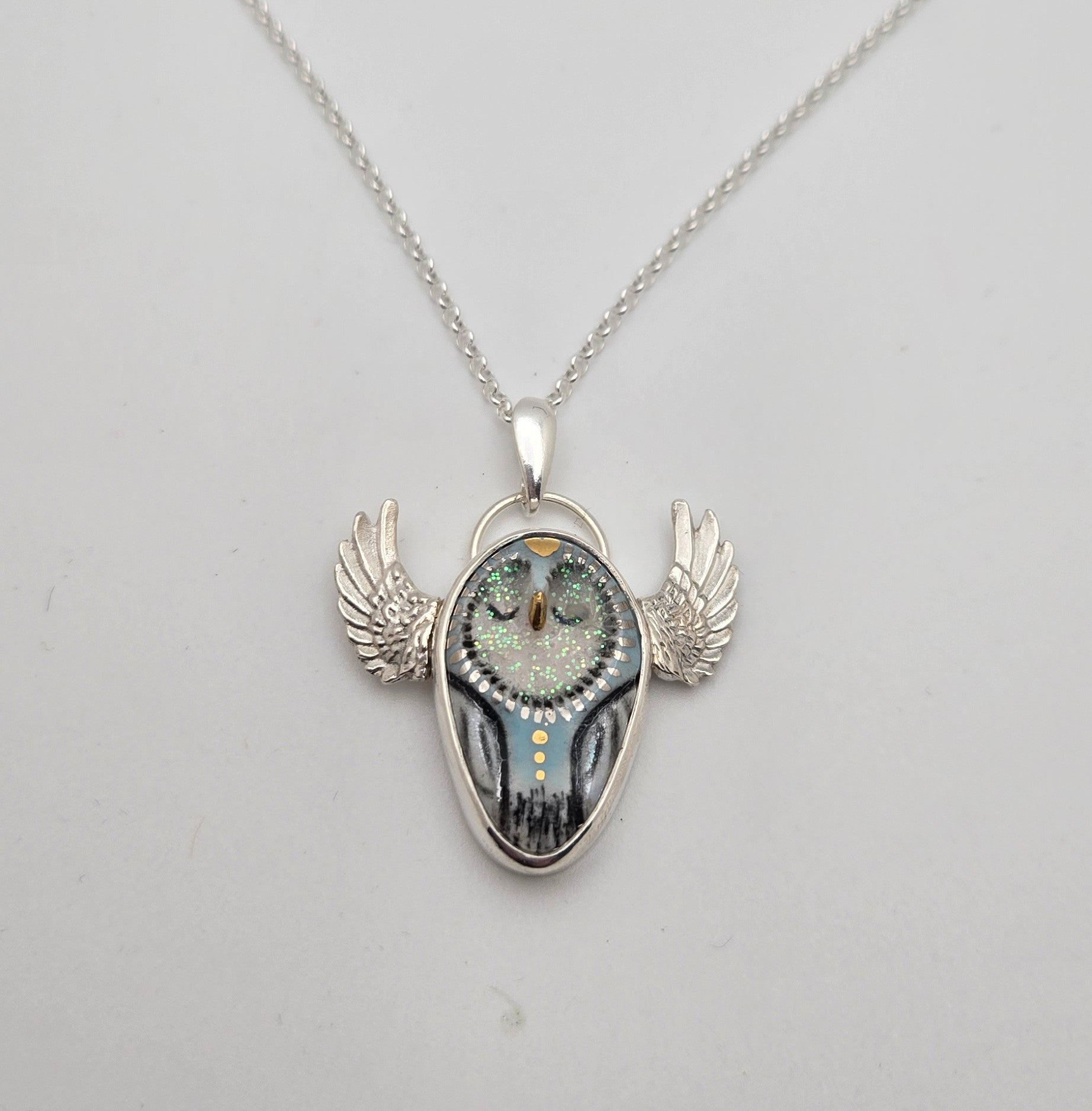 Expertly handcrafted and hand painted, this porcelain owl pendant exudes delicacy and charm. Its intricate details and sterling silver wings add a touch of elegance. Complete with a 20 inch rolo chain, this pendant is a must-have for any owl lover.