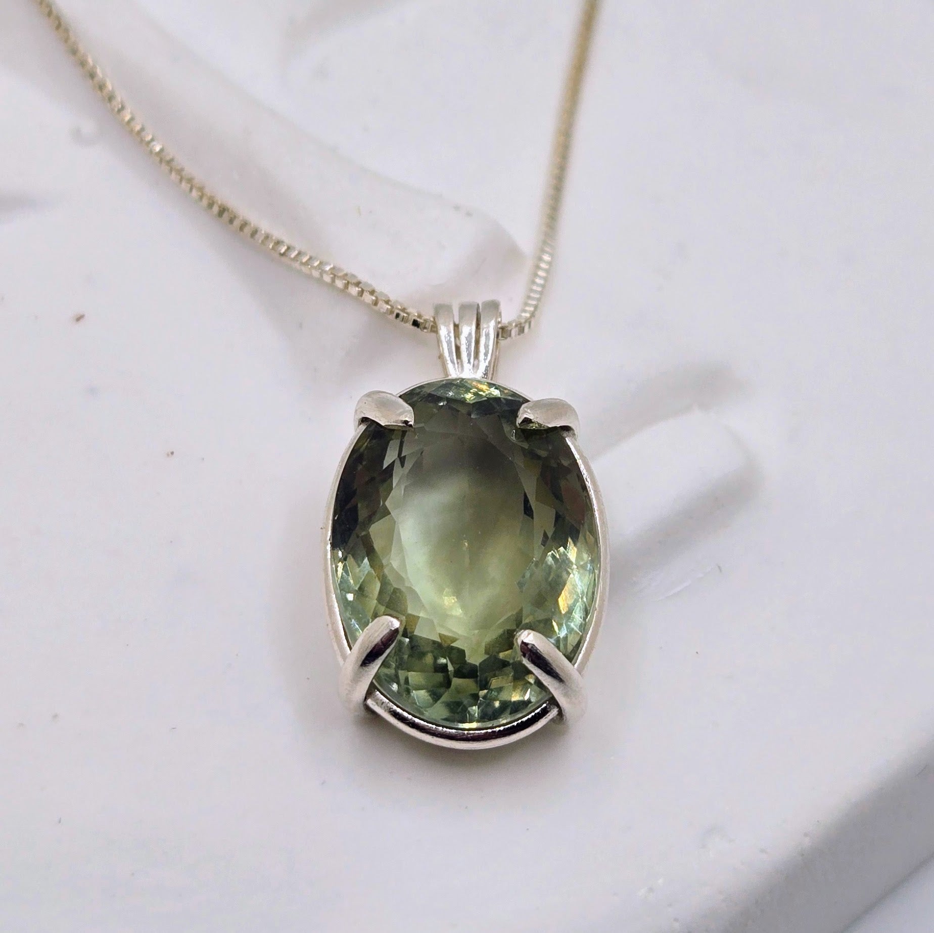 This exquisite prasiolite pendant showcases a stunning green gemstone expertly set in Argentium silver, known for its durability and tarnish resistance. Suspended from an 18-inch sterling silver chain, this basket set piece combines elegance with lasting quality, making it a refined addition to any jewelry collection.