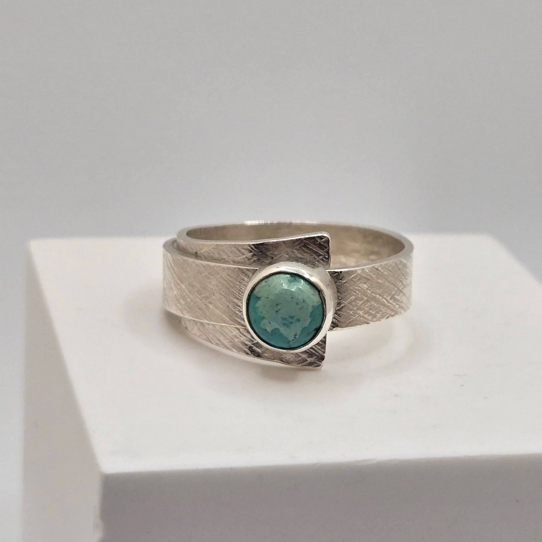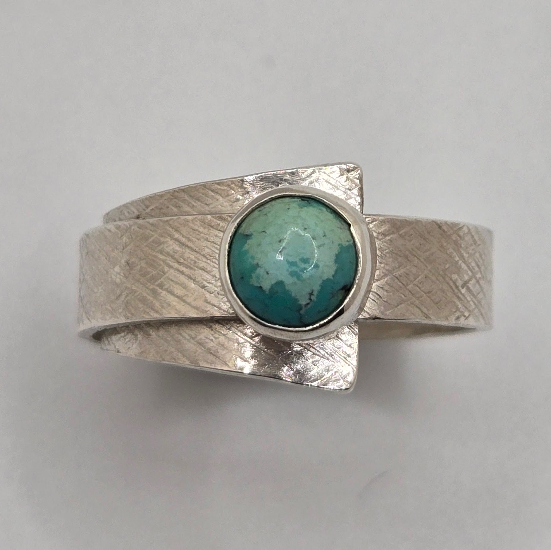 This sterling silver Turquoise Wrap Band Ring features a unique textured design on both sides of the band, enhancing its artisanal appeal. Sized at 9 but adjustable, it offers a comfortable and customizable fit. The vibrant turquoise stone adds a striking focal point, making this ring a sophisticated choice for those seeking both style and versatility in their jewelry collection.